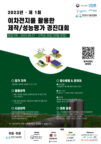 전시회 · 행사 · 대회 전체전시회행사대회 총 31건 좋은 추억으로 기억될 제1회 이차전지 배터리를 활용한 제작/성능평가 경진대회 06-11 | 조회수492 제1회 이차전지를 활용한 제작/성능평가 경진대회 안내 06-11 | 조회수482 이차전지 배터리 대회 한국EV기술인협회 주최하에 2023년 3개 배터리대회 진행합니다. 06-11 | 조회수506 2023 DSC 모빌리티 진로대전에 한국이브이기술인협회가 참가하였습니다. 06-11 | 조회수405 2023 DSC 모빌리티 진로대전에 배터리성능평가사 분들 무료 초대합니다^^ 06-11 | 조회수380 배터리 자원순환을 위한 우즈베키스탄 재제조 전시회에 참가한 한국EV기술인협회, 투린대학교, 치르치크시 테크노… 06-11 | 조회수361 1 2 3 4 5 6